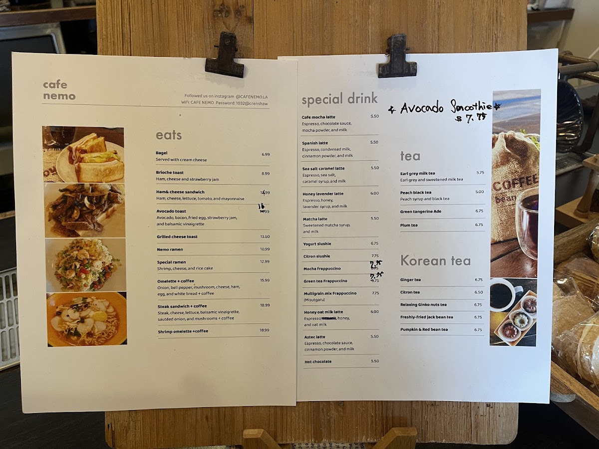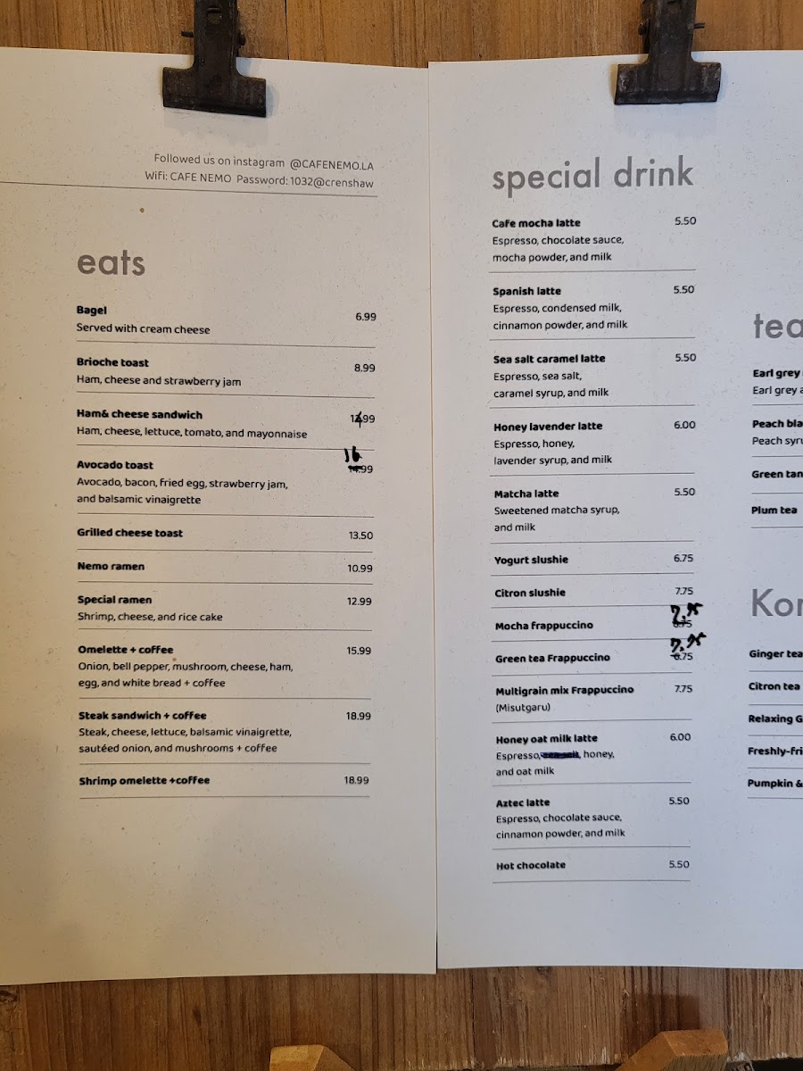 Tea lovers can indulge in flavors like Grape Green Tea, Happiness Paradise Green, and Muscat, or try a comforting Korean tea such as Ginger Tea or Relaxing Ginko Nuts Tea. The variety and creativity of the menu make Cafe Nemo a great spot for anyone seeking both familiar and unique flavors, all while offering a cozy atmosphere for relaxation.