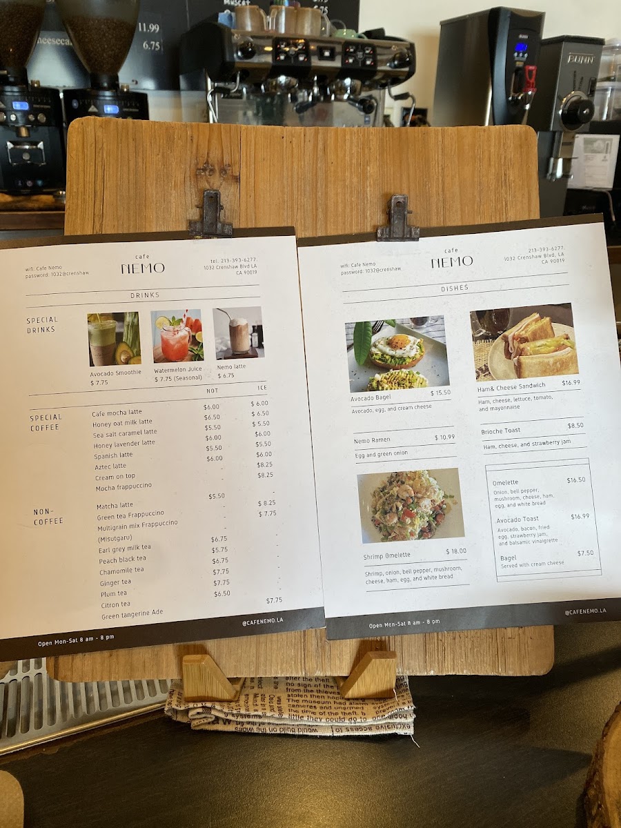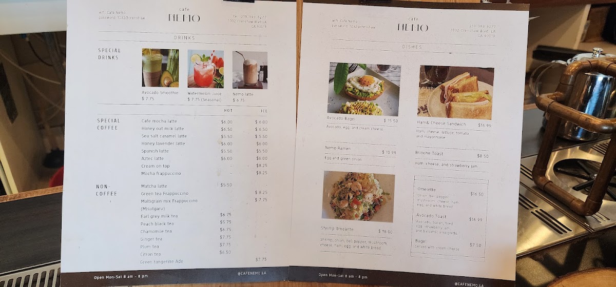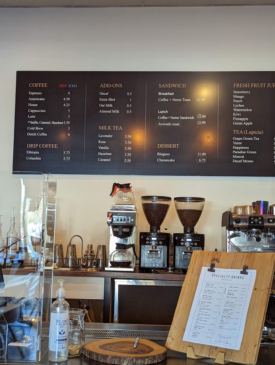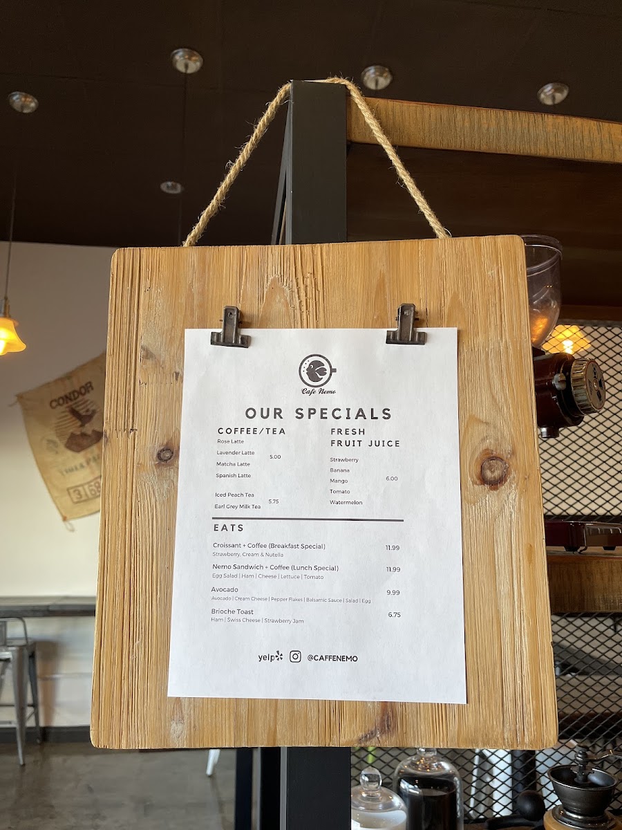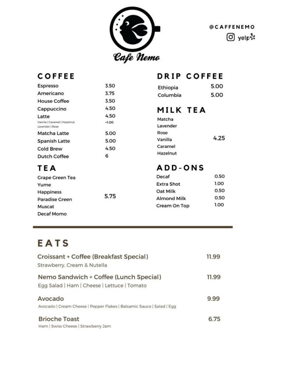 Cafe Nemo offers a diverse and appealing menu with a mix of beverages, light bites, and refreshing drinks. Their coffee selection includes classics like Espresso, Americano, House Cappuccino, and Latte, along with a range of special coffee options such as Cafe Mocha Latte and Spanish Latte. For those looking for a twist, the Honey Oat Milk Latte and Honey Lavender Latte are delightful choices. The drip coffee options, including Ethiopia and Colombia, cater to coffee aficionados seeking a high-quality brew. Add-ons like Decaf, Extra Shot, Oat Milk, and Almond Milk are available to customize your drink.